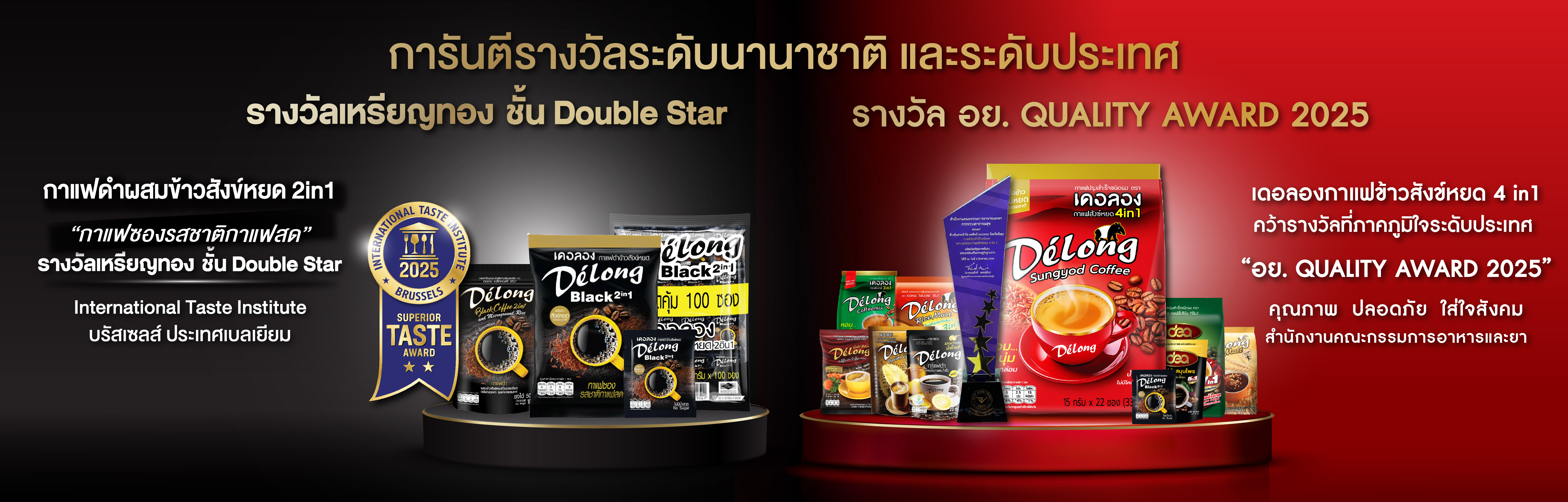กาแฟเดอลองข้าวสังข์หยด ได้รับรางวัลรางวัล อย. QUALITY AWARD 2025 ประเภท 2 "รางวัลผลิตภัณฑ์สุขภาพดีเด่น ประเภทส่งเสริมเศรษฐกิจฐานราก" รางวัลแห่งความสำเร็จนี้ เริ่มจากความร่วมมือส่งเสริมการปลูกข้าวสังข์หยดอินทรีย์คุณภาพใน จ.พัทลุง และสนับสนุนเกษตรกร