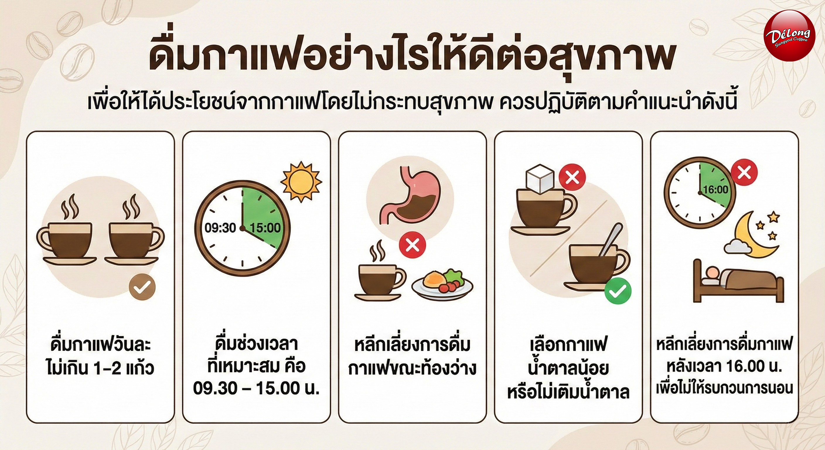 - ดื่มกาแฟวันละ ไม่เกิน 1–2 แก้ว